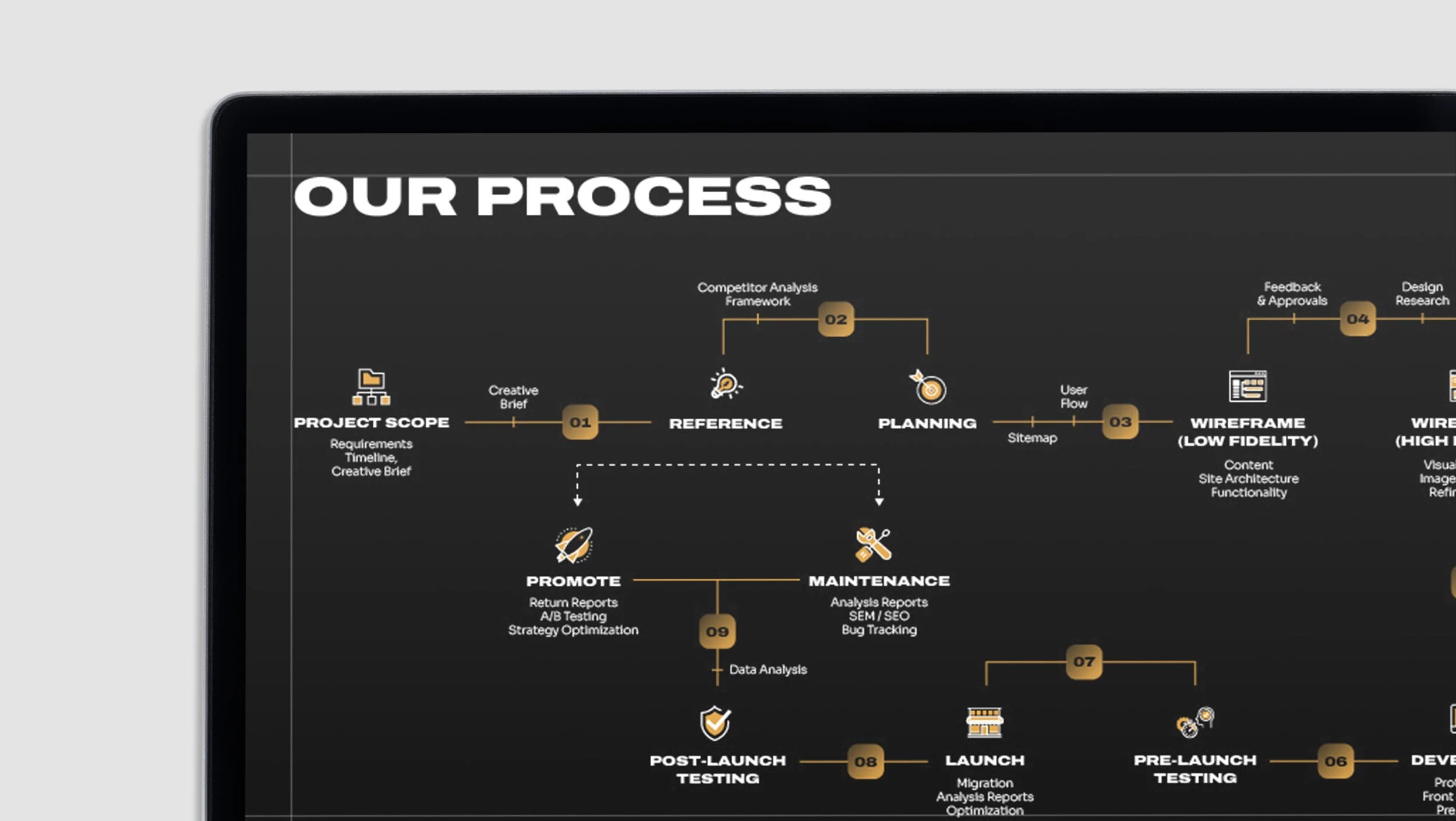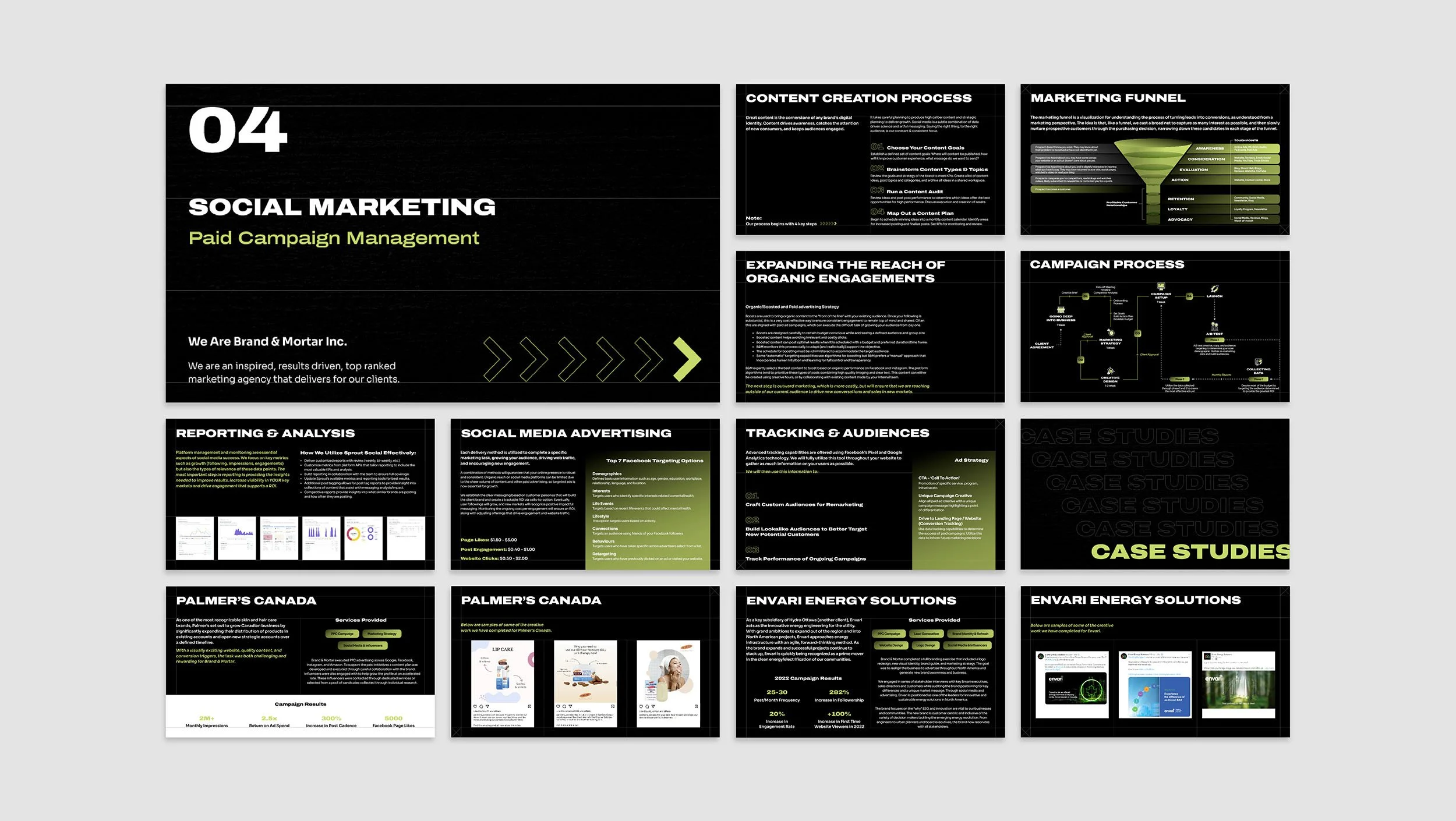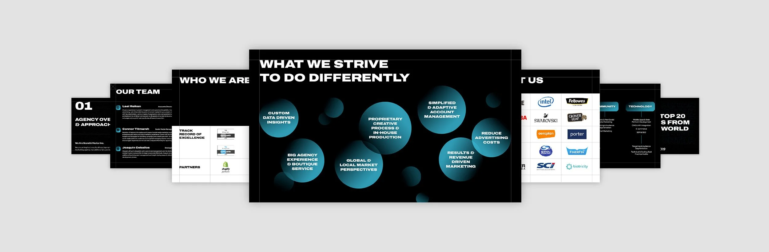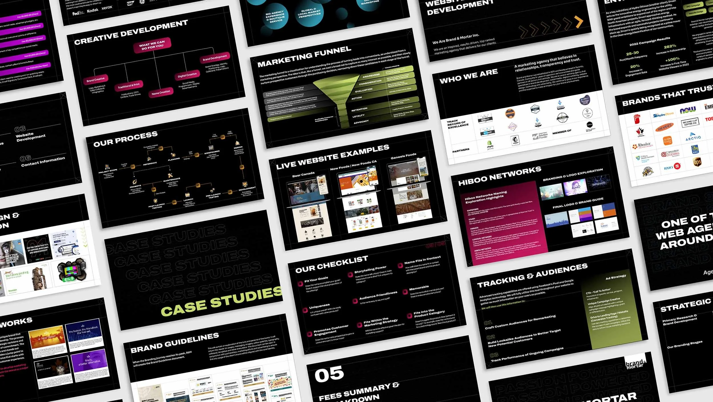 In response to the evolving economic climate and the competitive landscape within the industry, Brand & Mortar initiated a brand refresh initiative to stay ahead of current design trends. As part of this endeavour, one of the primary focuses was to redesign the pitch deck, a crucial tool used to attract new clients. Drawing insights from previous pitch decks, both successful and unsuccessful, and pinpointing areas for improvement, a 70+ page deck was designed to be seamlessly interchanged as needed. The deck was designed to include both editable pages and drag-and-drop functionality for quick and easy customization, ensuring versatility and effectiveness in every client presentation.